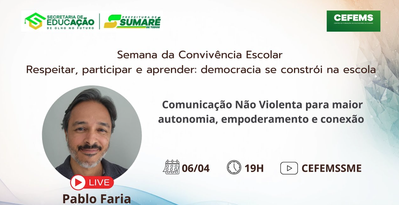 Esta palestra é parte das atividades da SEMANA NACIONAL DA CONVIVÊNCIA ESCOLAR, organizada conjuntamente pelo CEFEMS (Centro de Formação de Educadores de Sumaré), Secretaria de Educação e Prefeitura de Sumaré. O tema da semana é “Respeitar, participar e aprender, democracia se constrói na escola“, com lives de 06 a 11/4 no canal do Youtube do CEFEMS. Minha palestra poderá ser vista através deste link: Comunicação não-violenta para maior autonomia, empoderamento e conexão.
